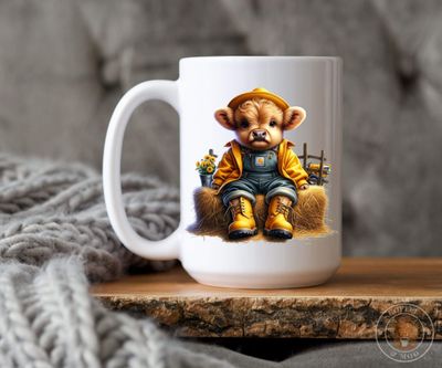 Brace yourself, because this mug features the world’s cutest tiny farm overlord — a baby Highland cow dressed like he’s clocking in for a full day of supervising humans who clearly don’t know what they’re doing.